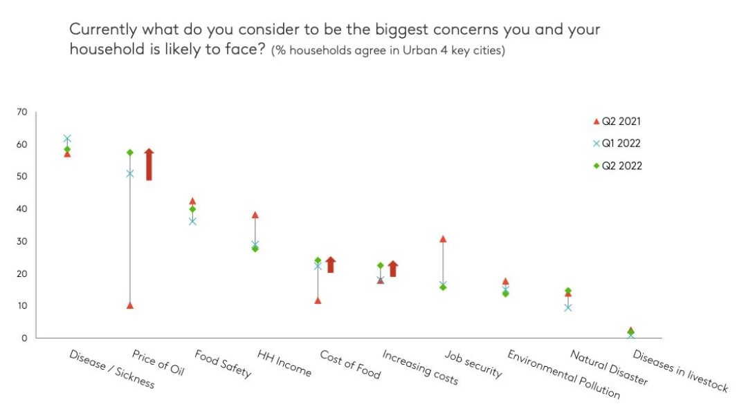 Mặc dù tình hình dịch bệnh khả quan hơn, nhưng chi phí sinh hoạt gồm giá xăng dầu/ gas, đến giá thực phẩm lại trở thành mối bận tâm lớn đối với người tiêu dùng vào nửa đầu năm 2022. Bên cạnh đó, ngành hàng tiêu dùng đang tiến gần đến mức lạm phát cao nhất trong những năm gần đây khi chạm đỉnh 7% khiến người mua cân nhắc nhiều hơn về giá cả.